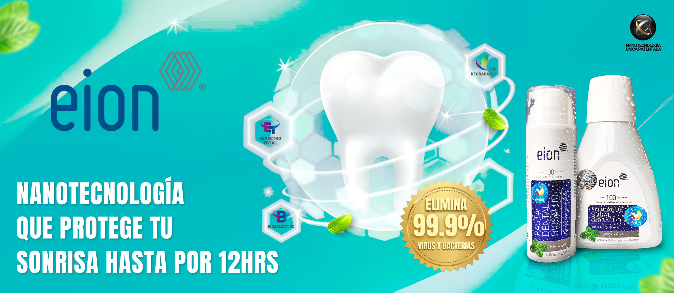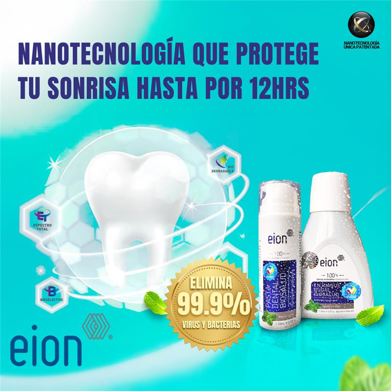 "Gracias a su nano bio molécula patentada, el enjuague y la pasta Eion by Éviter mantiene tu boca limpia y libre de gérmenes que pueden causarte caires, mal aliento o infecciones de cualquier tipo."
